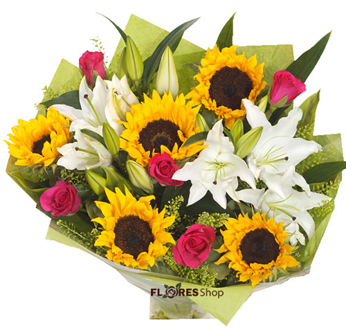 Majestoso e belissimo buque confeccionado com 5 girassóis, Lírios Brancos e 5 rosas cor de rosas