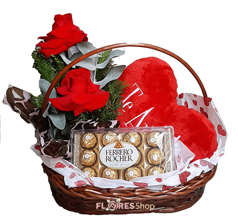 01 coração de pelúcia pequeno, 01 caixa de Ferrero Rocher e um arranjo com 2 Rosas Importadas.