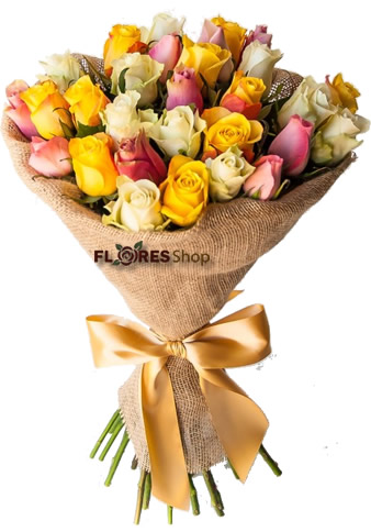 São 30 rosas, em cores variadas, folhagens e embalado com juta e laço. As cores podem variar de acordo com a disponibilidade na loja.