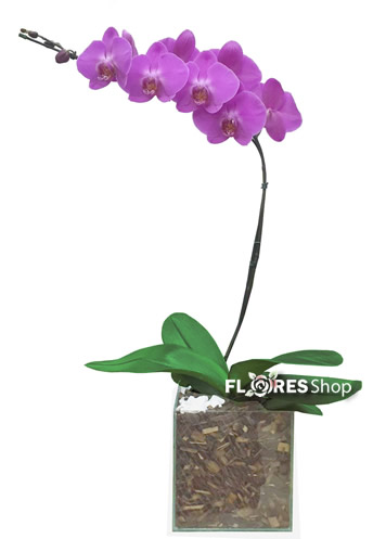 Charmosa Orquídea Phalaenopsis plantada em vaso de vidro.